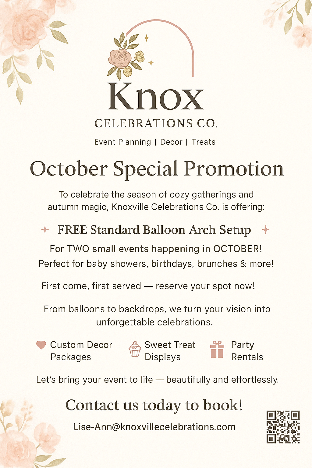 At Knox Celebrations Co. We believe every milestone deserves to be marked with style, heart, and a touch of Southern charm. Based in Knoxville, Tennessee, we specialize in event planning, party rentals, custom décor, and sweet treats. Whether you’re planning an intimate gathering or a grand celebration, our team is here to design every detail so your event feels effortless and unforgettable.